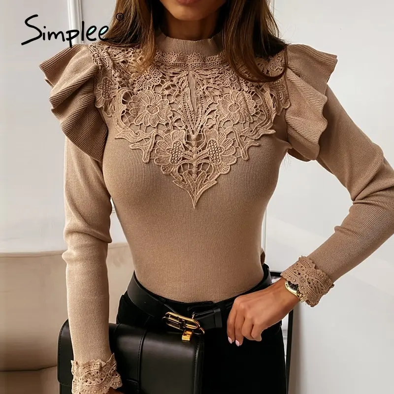 Best Sweaters from Simplee Apparel for Shirts Simplee Ruffle Khaki Top Knitted-Top Flower Long-Sleeve Winter Fashion New Solid